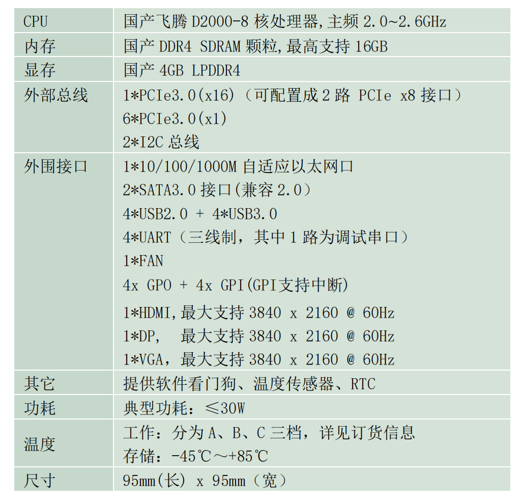 CPB7103 是一款以国产飞腾 D2000(8 核)处理器为核心的高可靠 性的 COMe Compact 计算机模块,兼容 PICMG(PCI Industrial Computer Manufacture`s) COM Express Type6 型规范,集成了飞腾 X100 桥片 以及丰富的外部接口。该产品内存全表贴、能效比高、具有完善的加 固定位孔、兼容性好、互换性良好等优点,在开发使用中具有相当的 灵活性,可应用于网络安全、政务办公平台、轨道交通、能源控制等 领域。